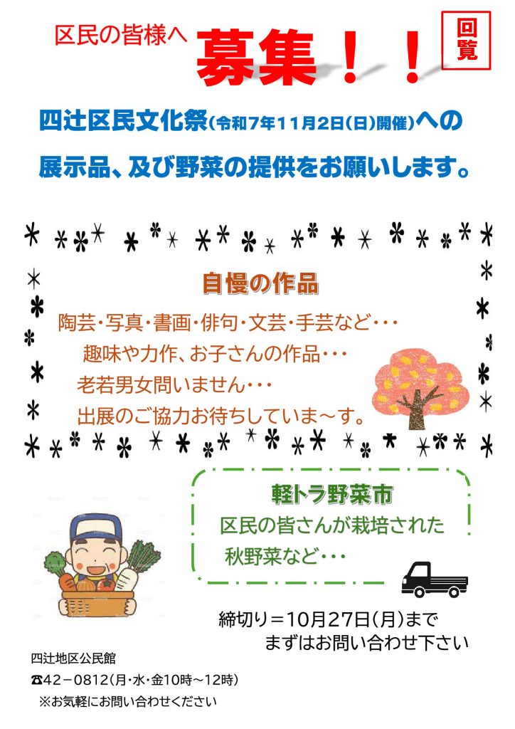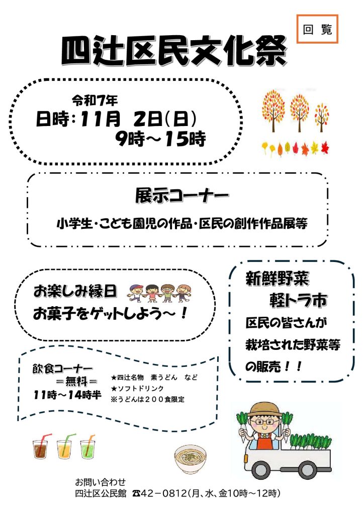 お知らせ 四辻区民文化祭のお知らせ 2025年10月18日 by yotutujiku 令和7年11月2日(日)開催の四辻区民文化祭のお知らせです。 展示コーナー、飲食コーナーをはじめ、軽トラ市・お楽しみ縁日等、充実した催しを企画しております。 皆様のお越しを心よりお待ちしております。