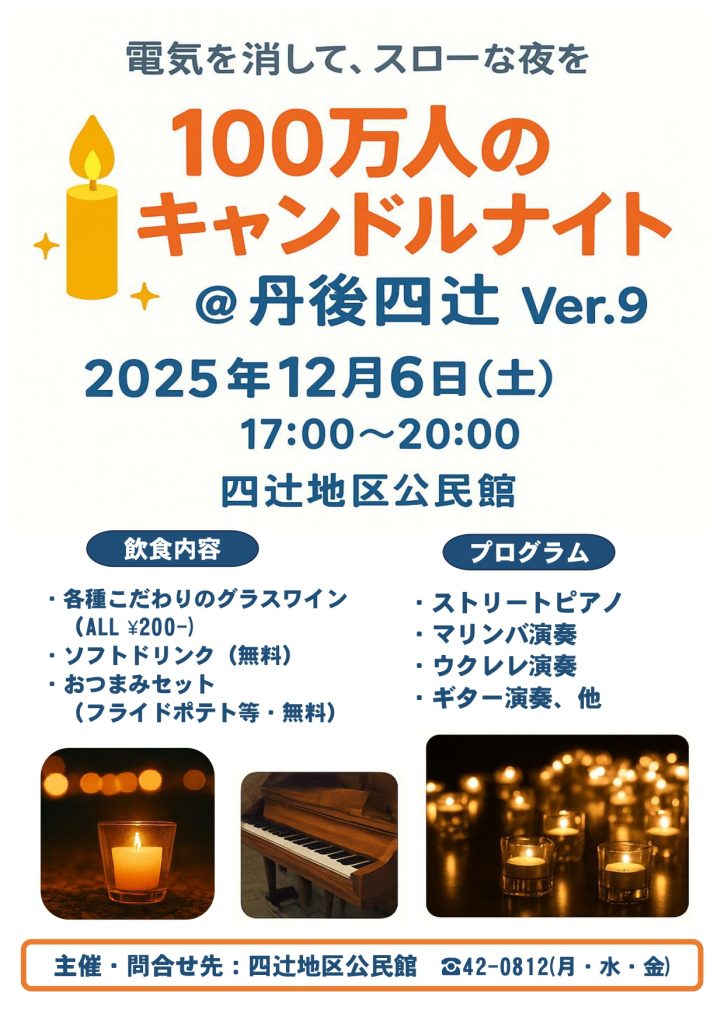 お知らせ 100万人のキャンドルナイト 開催のお知らせ 2025年11月18日 by yotutujiku 毎年恒例の100万人のキャンドルナイト開催のお知らせです。 開催日時 2025年12月6日(土) 17:00~20:00 開催場所 四辻地区公民館 ”電気を消して、スローな夜を” 🕯 キャンドルの灯りに包まれながらスローな夜を過ごしませんか 🕯