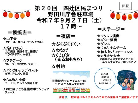 令和7年9月27日(土) 17時~ 野田川庁舎駐車場に於きまして 第20回 四辻区民まつりを開催します。 キッチンカー、模擬店、夜店も充実していますので是非ご来場下さい。