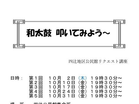 現在、リクエスト講座として和太鼓の講座を開催しております。 10/2~10/31まで計5回の開催予定です。 参加者の皆さん、とても熱心に取り組んでおられます!