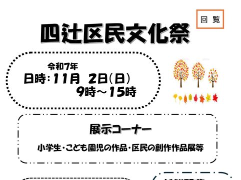令和7年11月2日(日)開催の四辻区民文化祭のお知らせです。 展示コーナー、飲食コーナーをはじめ、軽トラ市・お楽しみ縁日等、充実した催しを企画しております。 皆様のお越しを心よりお待ちしております。